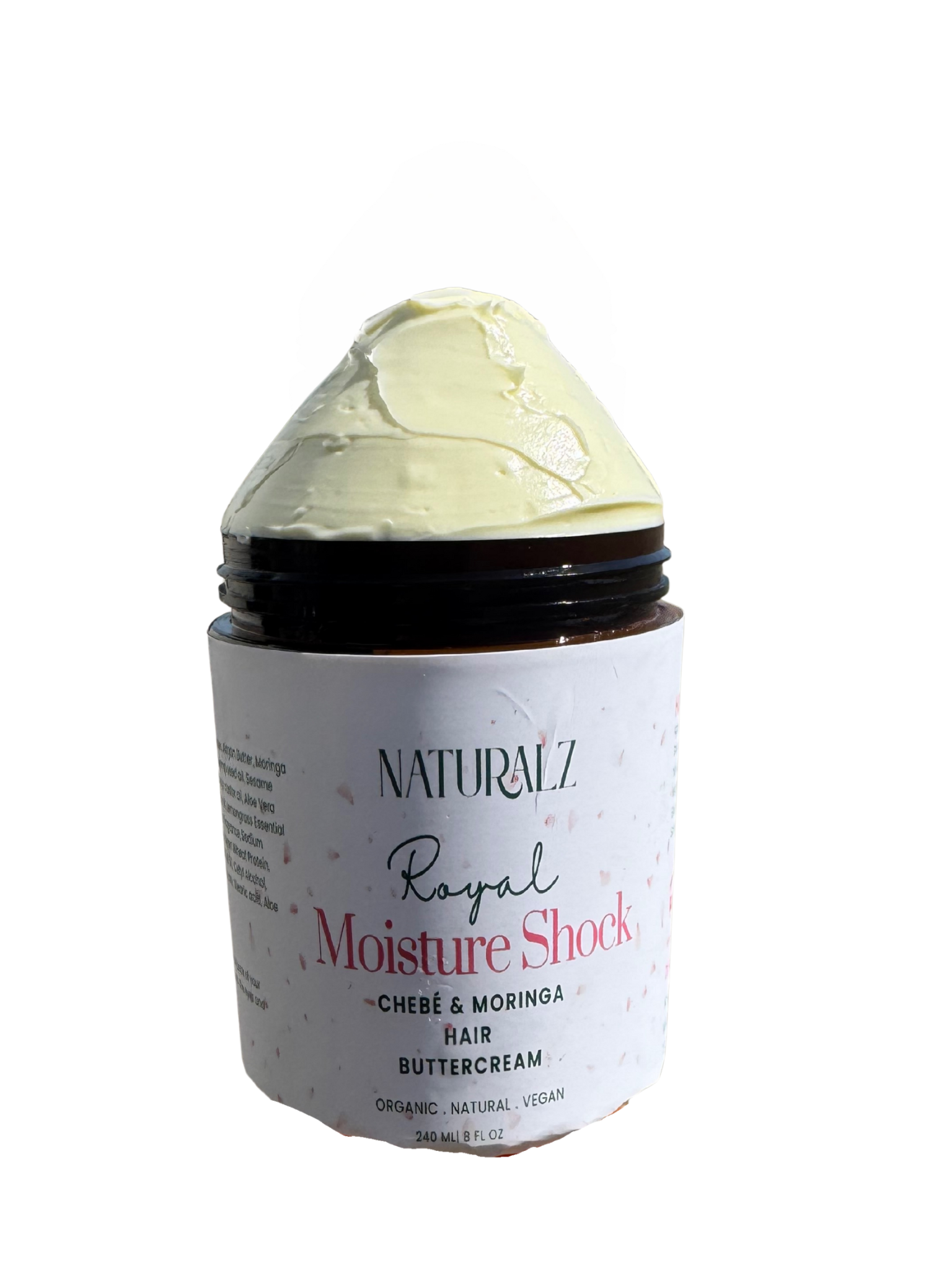 Moisture is the foundation of length retention — without it, even the healthiest new growth is lost to dryness and breakage. The Royal Moisture Shock Buttercream transforms this truth into a ritual. Handcrafted with a decadent blend of butters and nutrient oils, it infuses your crown with rich moisture while sealing in softness and resilience. At its core, Chebe and Moringa deliver the ancestral wisdom and modern nourishment your hair needs to thrive.